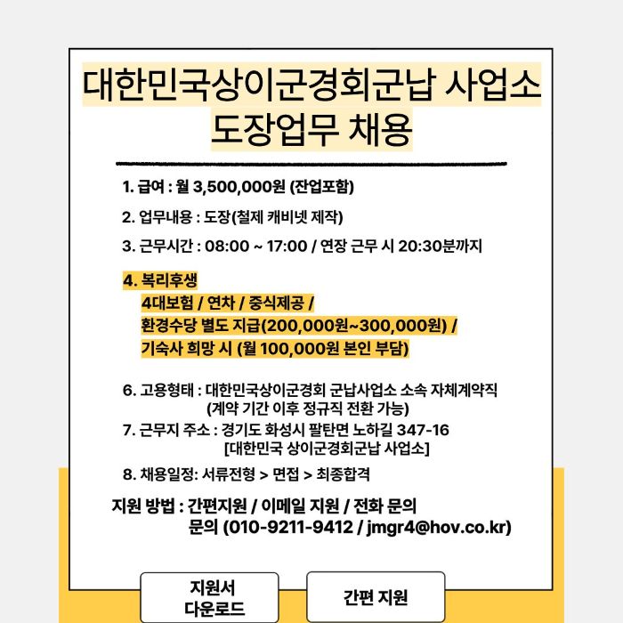 [경기도/화성/도장 업무 채용]군납사업소 철제 캐비넷 도장업무 채용